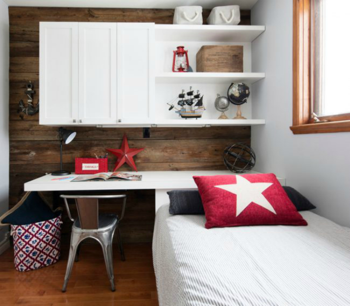 В небольшой комнате есть смысл отказаться от подоконника в пользу навесного письменного стола. Естественный свет обеспечит комфортные условия для работы и позаботится о детском зрении.