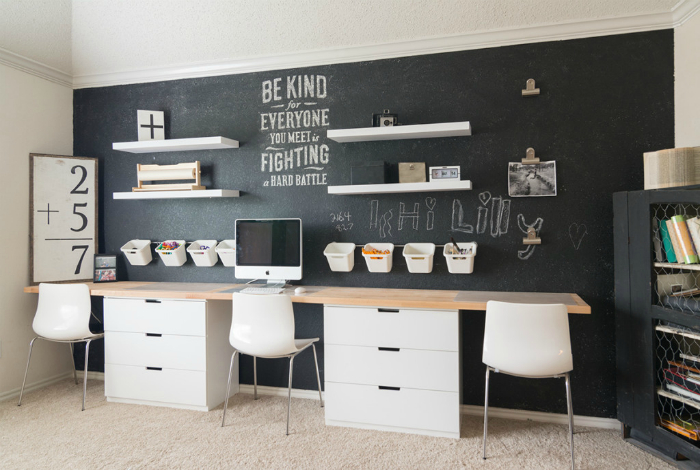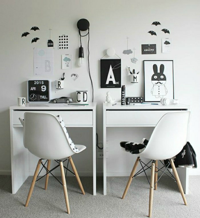 Прекрасный пример оформления рабочего пространства в комнате, которую делят двое разнополых детей подростков. Два компактных идентичных стола, одинаковые стулья, но разный декор, выдержанный в черно-белых цветах.