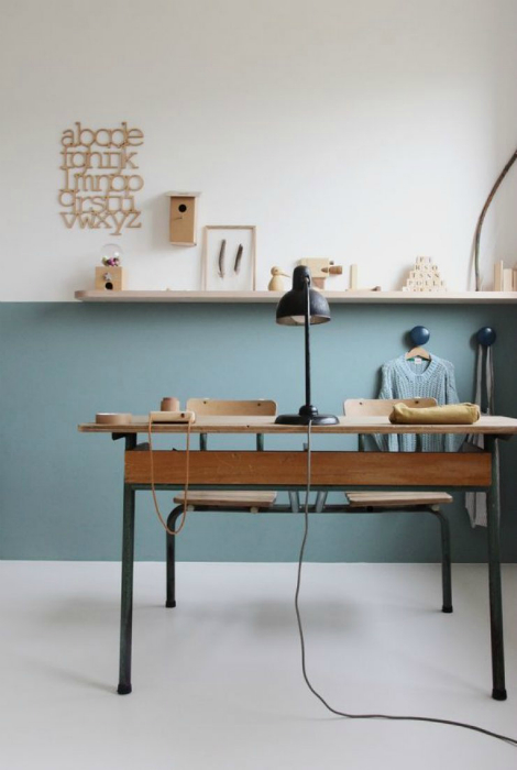 Деревянная парта, старая настольная лампа и обилие тематического декора - нестандартное, но довольно интересное решение для оформления рабочего места в комнате подростка.