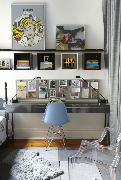 Стильная рабочая зона с длинным навесным столом, оборудованным выдвижными ящиками, открытыми книжными полками и красивым деревянным стулом с кожаной спинкой наверняка понравится людям практичным, предпочитающим качественную и функциональную мебель. Яркие декорации помогут адаптировать подобное рабочее место для ребенка младшего школьного возраста, а со временем от них можно будет избавиться.