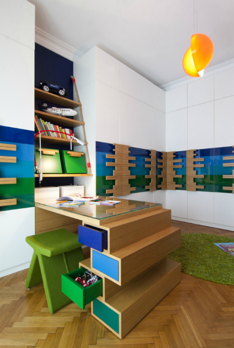 Рабочее место ребенка младшего школьного возраста должно быть в меру ярким и интересным. Необычный письменный стол с оригинальным размещением ярких выдвижных ящиков и оригинальной подвесной полкой в нише наверняка, заинтересует и привлечет внимание ребенка.