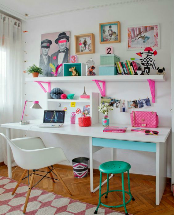 Белоснежная рабочая зона с обилием ярких акцентов розового и голубого цвета, а также множеством очаровательных мелочей - прекрасное решение для дизайна комнаты девочки-школьницы.
