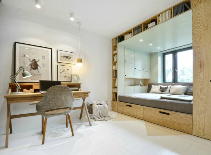 Стильный и очень уютный дизайн детской с компактным письменным столом и оригинальным оформлением уголка для чтения у окна. Подобное оформление подойдет для жизни и школьника, и подростка и даже студента.
